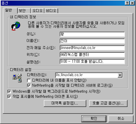 "Windows¸¦ ½ÃÀÛÇÒ ¶§ ¹é±×¶ó¿îµå·Î NetMeeting ½ÃÀÛ(R)"À» üũÇÏÁö ¾ÊÀ¸¸é È£ÃâÀ» ¹Þ°í ½ÍÀ» ¶§´Â ³Ý¹ÌÆÃÀ» °¡µ¿ÇØ¾ß ÇÑ´Ù.